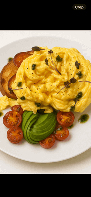 Scramble Egg, Avocado, Chorizo, Cherry Tomato, Basil Pesto in Sourdough