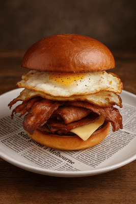 Two Bacon, Two Fried Eggs, Hash Brown, Spinach, Aioli, Avocado, Tomato and Cheese in a Milk Bun