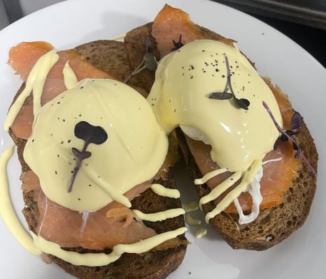English Muffin, Wilted Spinach, Choice of Bacon / Salmon / Ham / Salmon, Herb roasted Tomato and hollandaise.